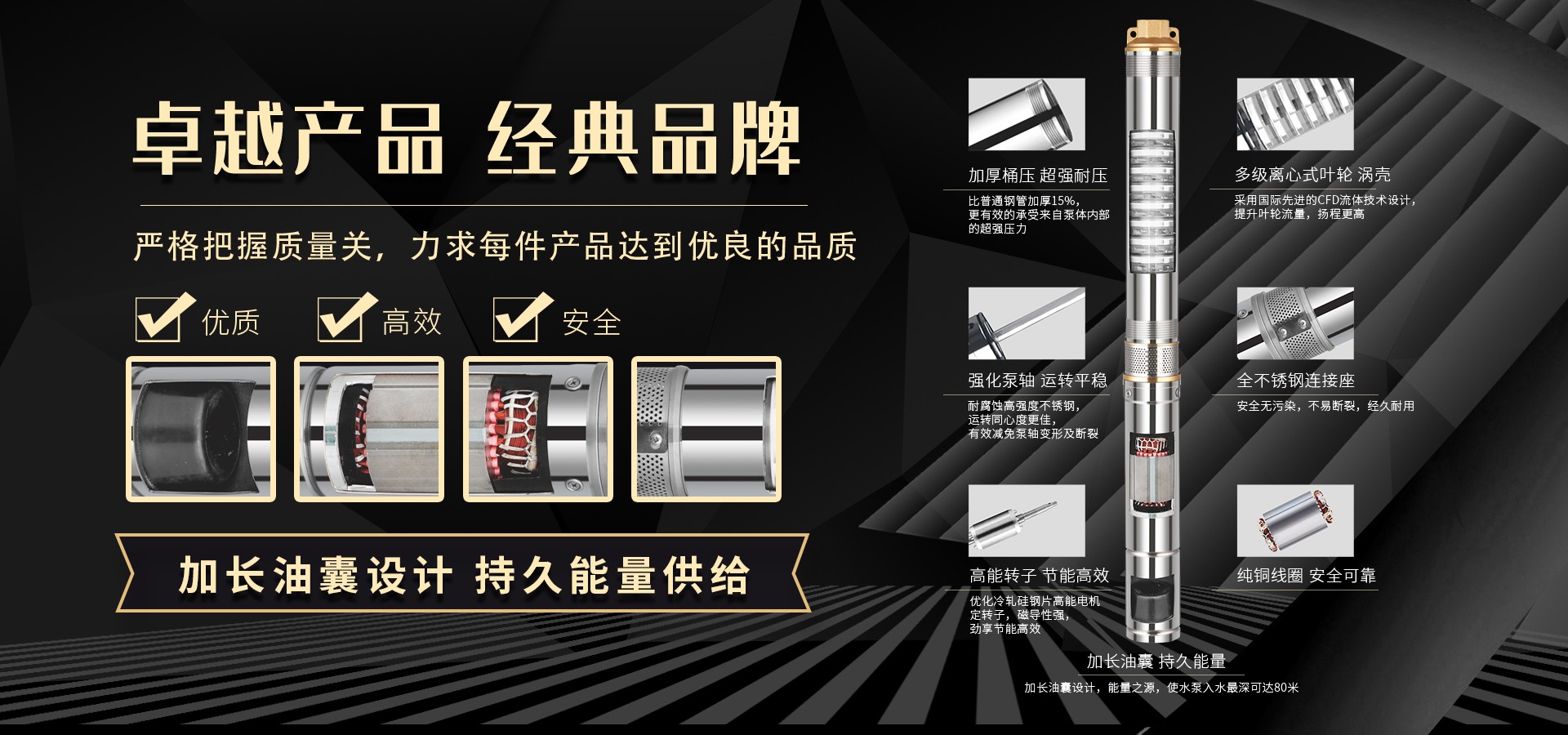 不僅僅是泵,更是流動的科技。十多年來,本公司堅持走:以質量求生存以科技創(chuàng)新求發(fā)展,重合同守信用的道路,生產經營得到迅速發(fā)展。更希望以后不管從發(fā)達城市到新農村,從工業制造到尖端科技產業都隨處可見創(chuàng)江井泵的身影,創(chuàng)江深井泵已成為干萬用戶心目中優(yōu)質和信心的保證我們將以優(yōu)質的產品和最完善的售后服務來真誠與各界朋友開展廣泛的合作,共同創(chuàng)造一個美好的未來!